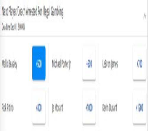 北京时间10月26日,NBA版本的“反赌风暴”仍是舆论的焦点,下一位被逮捕的NBA人员会是谁?已经有相关赔率开出,马利克-比斯利成为头号热门,湖人球星詹姆斯和火箭新援杜兰特也都排名靠前。