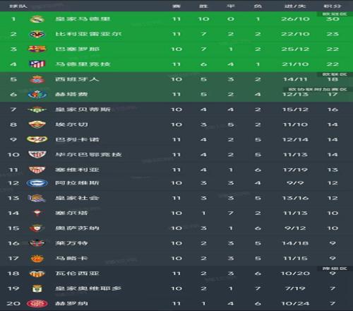 北京时间11月2日,西甲第11轮结束了5场比赛,最新积分榜如下!