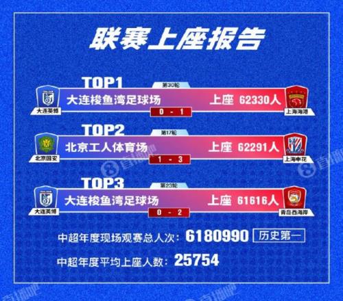 本赛季中超联赛的总现场观众高达6180990人次,首次突破600万大关,刷新了历史纪录。大连英博主场与上海海港的收官战上座人数达到了62330,创下了赛季之最。整个赛季,一共12场比赛上座人数跨过了6万人大关。